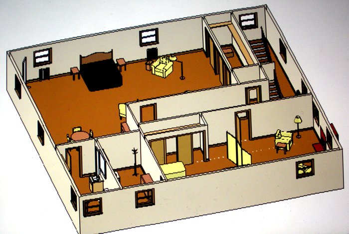 near kitchen; listening “hole” at eye level (behind office wall painting)